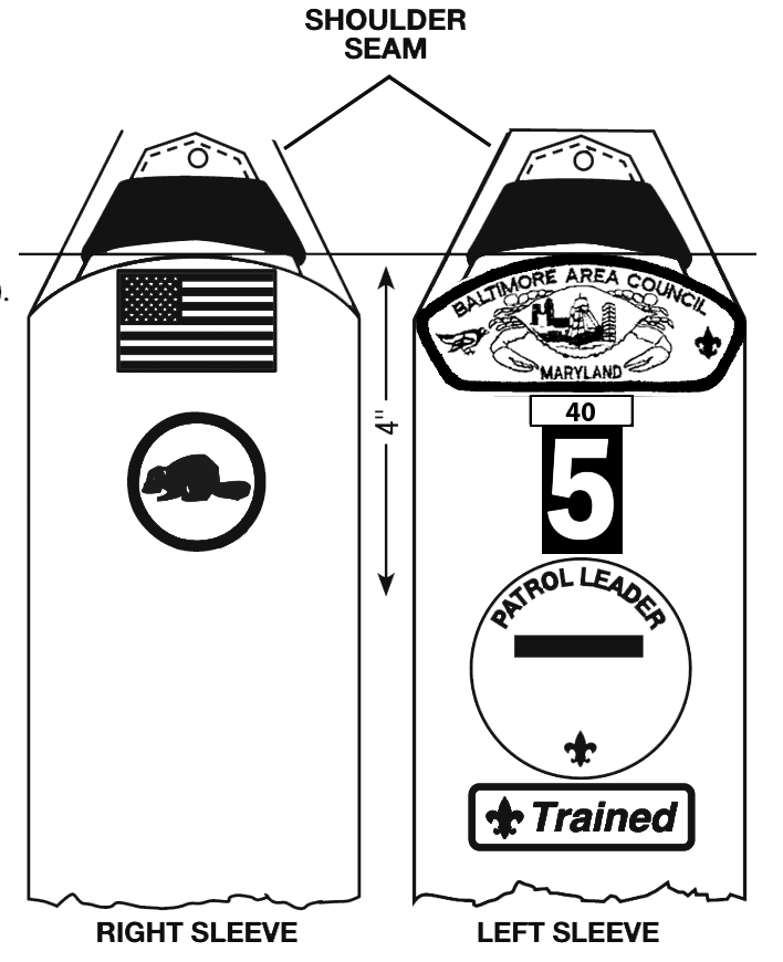 - Patrol Patch: 4 inches down from the shoulder seam, centered below the American Flag patch. Your Patrol Leader will give you’ll get one of these when you’re assigned to a patrol.